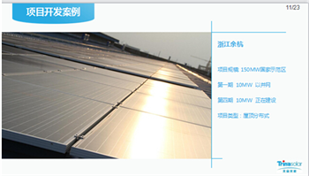 下面我跟大家介紹幾個案例,其中一個浙江余杭,它是國家18+12國家示范區的項目,總容量是150MW,這是典型離散式分布式的案例。此外還有山東沂水的項目,這是山東沂水地區最大的三級運營商,上海金山項目,10MW,5月份已經成功并網了。山東齊河項目,5月份已經成功并網。這是連云港光伏村的項目,這是中國光伏扶貧的南北的縮寫,是2013年天合配合江蘇省政協某個領導給予資金支持,然后就誕生了光伏扶貧的概念。本來有領導要去看一下,結果看了一下圖片,不能做推廣,不符合扶貧的概念,但是這個理念已經帶來了模式的改變,光伏扶貧可能真正解決貧困人口的問題。